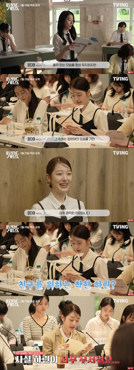 이와 함께 대본 리딩에서 장다아는 착한 얼굴과 달리 "어때 색깔?" "행복해?"라면서 살벌함이 느껴지는 대사를 소화해 반전 매력을 기대케 했다. 여기에 '사실 하린이 너무 무서워요'라는 자막으로 '피라미드 게임'에서 반전 매력 뽐낼 장다아의 활약상에 기대감을 한층 더 불어넣었다.