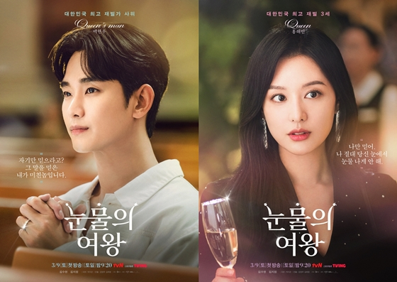 오는 3월 9일 첫 방송될 tvN 새 토일드라마 '눈물의 여왕'(극본 박지은, 연출 장영우·김희원, 제작 스튜디오드래곤·문화창고·쇼러너스)은 퀸즈 그룹의 재벌 3세이자 백화점의 여왕 홍해인(김지원 분)과 용두리 이장 아들이자 슈퍼마켓 왕자 백현우(김수현 분), 3년 차 부부의 아찔한 위기와 기적처럼 다시 시작되는 사랑 이야기를 담은 드라마다. 믿고 보는 배우 김수현과 김지원이 대한민국 최고 재벌 부부로 만나 뜨거운 관심을 모으고 있다.