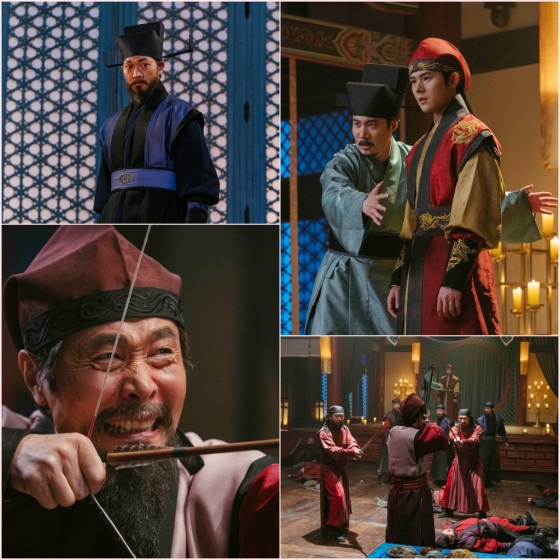 오늘 공개된 스틸에는 혈투 속 연회장 앞을 경호하는 이자림부터 황제를 향해 활시위를 당기는 박진의 모습까지 담겨 있어 팽팽한 긴장감을 안긴다.