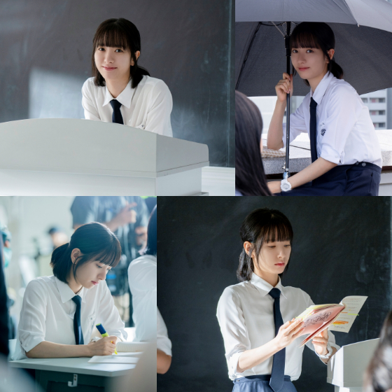 또 다른 사진 속 김지연은 대본에 열중, 실제 공부에 집중하고 있는 고등학생을 방불케 한다. 특히, 햇살이 내리쬐는 가운데 형광펜을 들고 대본을 바라보고 있는 그에게서 첫사랑처럼 싱그러운 면모가 느껴지기도.