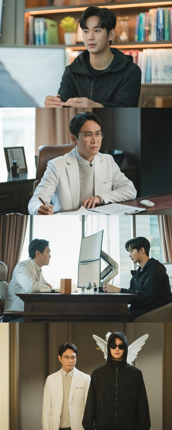 이런 가운데 공개된 사진 속에는 정체가 탄로 날까 선글라스에 모자까지 뒤집어쓰고 병원 상담실을 찾은 백현우(김수현 분)와 그런 그의 이야기를 진지하게 듣고 있는 의사(오정세 분)의 모습이 포착됐다. 과연 완벽해 보이는 재벌 사위 백현우가 남들의 눈을 피해 병원을 찾은 이유는 무엇일지 궁금해진다.