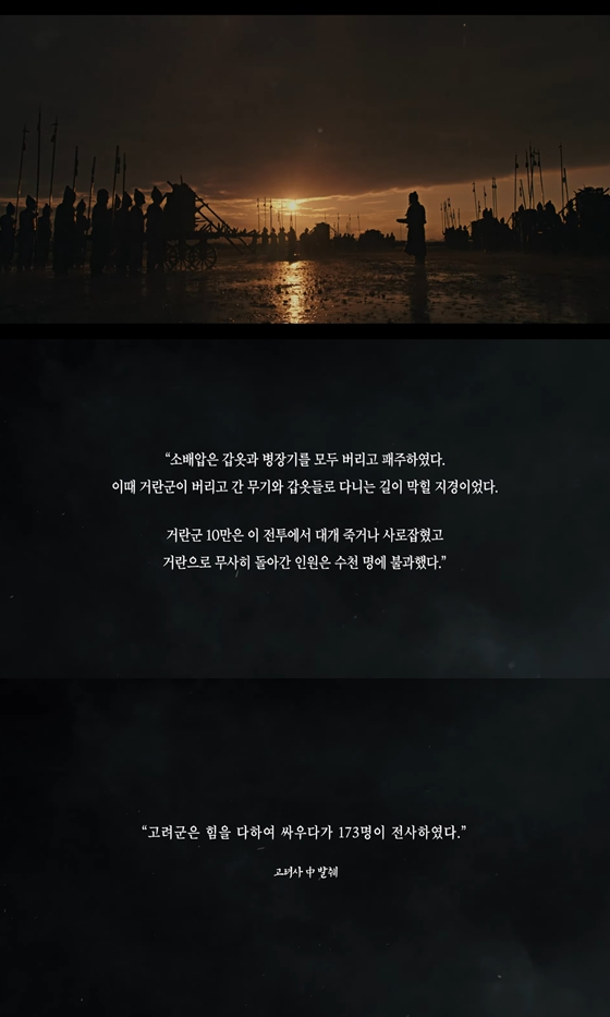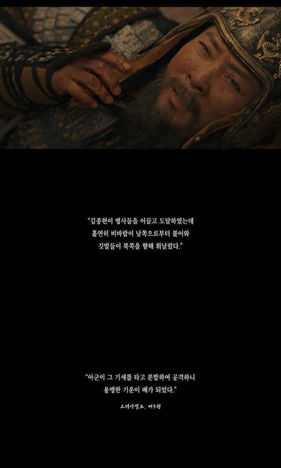 이어 또 다른 자막은 강감찬이 고려군과 함께 거란군을 물리친 후 상황이다. 비가 오고, 강감찬이 짓밟힌 민들레, 호각을 집어든 후 장면이다. 이때 등장한 자막은 이랬다.