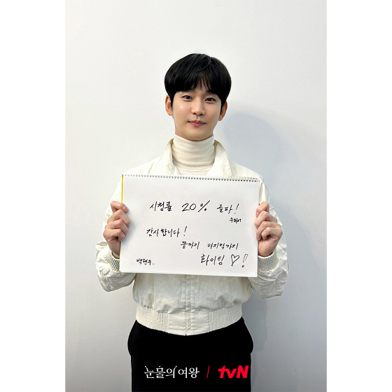 김수현, 김지원, 박성훈, 곽동연, 이주빈 등은 환한 미소로 '눈물의 여왕' 시청률 20% 돌파에 기뻐하는 모습이다.