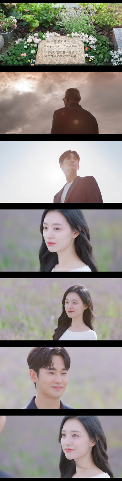 '눈물의 여왕'은 백현우, 홍해인이 아이도 낳고, 행복한 가정을 꾸렸다. 눈물이 아닌, 웃음 가득한 해피엔딩이었다. 그리고, 긴 시간이 흘렀다. 홍해인의 이름, 1990년 8월 22일 출생일과 2074년 4월 7일 사망일이 적혀 있는 묘비가 등장했다. 홍해인은 무려 84세까지 장수했다. 또 홍해인의 묘비를 쓰다듬는, 노년의 백현우가 모습을 드러냈다.