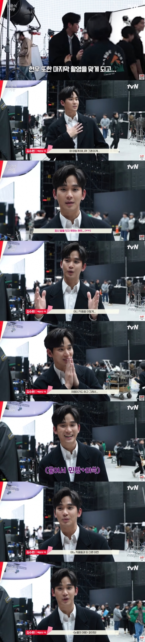 김수현은 잠시 말을 잇지 못했고, 눈물이 그렁그렁했다. 그는 "작품을 이렇게 꽉 차게 이렇게 길게 해본 게 또 처음이기도 하고 그래서"라면서 쉽게 말을 잇지 못하며 울먹였다.
