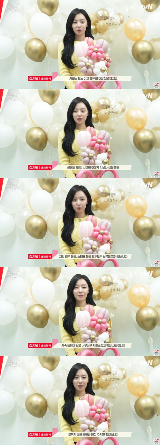 김지원은 "'눈물의 여왕'에서 홍해인 역을 맡은 김지원입니다. 저희는 오늘 이제 16부의 대장정을 마치고, 마지막 촬영을 했어요"라고 밝혔다.