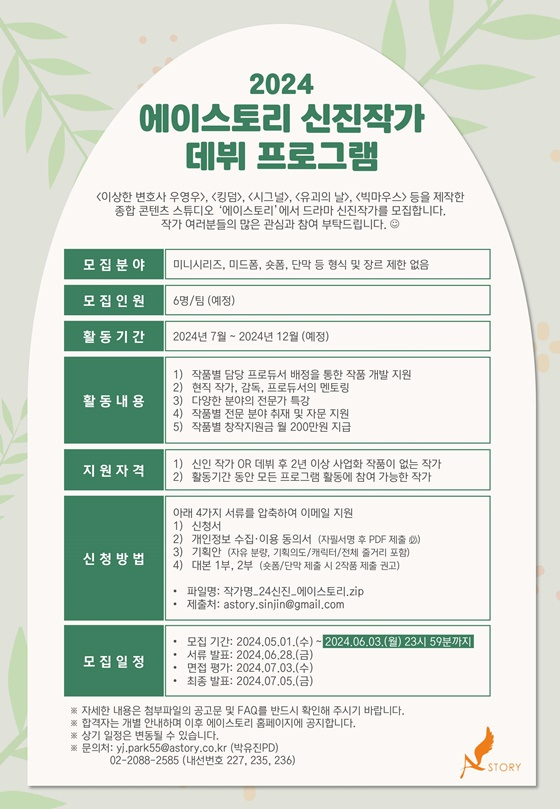 '2024 신진작가 데뷔 프로그램'은 5월 1일부터 6월 3일까지 이메일로 지원 가능하며, 자세한 내용과 신청 방법 등은 에이스토리 공식 홈페이지 공지사항을 통해 확인할 수 있다.