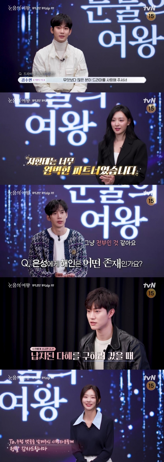 4일 방송된 tvN 토일드라마 '눈물의 여왕'(극본 박지은·연출 장영우, 김희원) 스페셜 방송에서는 작품을 이끌어 온 김수현(백현우 역), 김지원(홍해인 역)을 비롯해 박성훈(윤은성 역), 곽동연(홍수철 역), 이주빈(천다혜 역)이 생생한 촬영 비하인드 스토리를 전해 색다른 재미를 선사했다. 여기에 '고모 크러쉬' 김정난(홍범자 역)이 직접 내레이션에 참여해 스페셜 방송의 의미를 더했다.