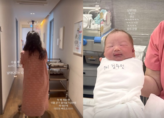 그는 출산 후 빠른 회복력을 보였다. 김수민은 "수술 후 20시간 경과. 날아다니는 나"라며 병원 복도를 걷고 있는 스스로에 뿌듯해했다.