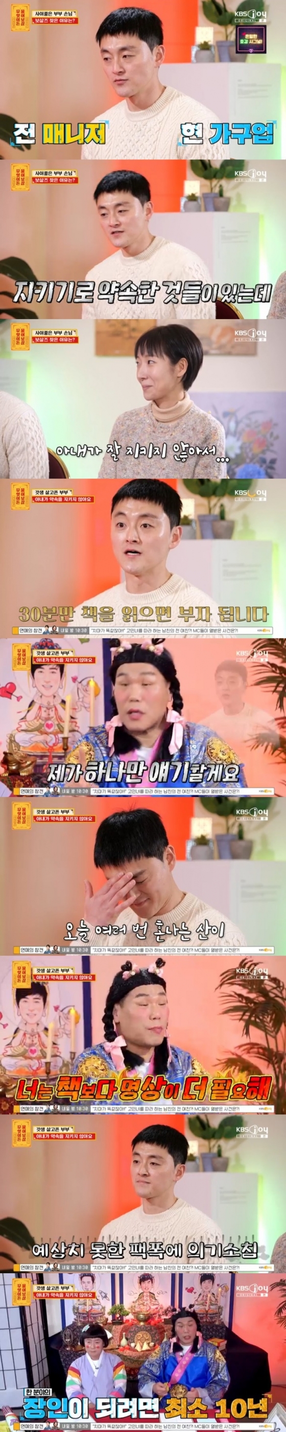 10일 오후 방송된 KBS JOY '무엇이든 물어보살'에는 전 연예인 매니저로 근무하고 현재 가구제작업에 종사 중인 30대 남편과 아내가 사연자로 출연했다.