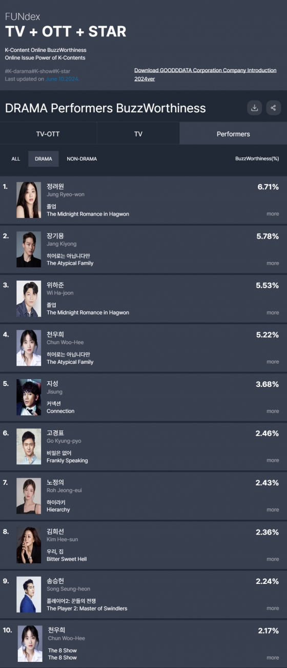 굿데이터코퍼레이션의 공식 플랫폼 펀덱스(FUNdex)에서 발표한 6월 1주차 조사는, 2024년 6월 3일부터 6월 9일까지 방송 또는 공개 중이거나 예정인 TV드라마와 OTT 오리지널 드라마 그리고 각 프로그램에 출연한 출연자를 조사 대상에 포함했다.