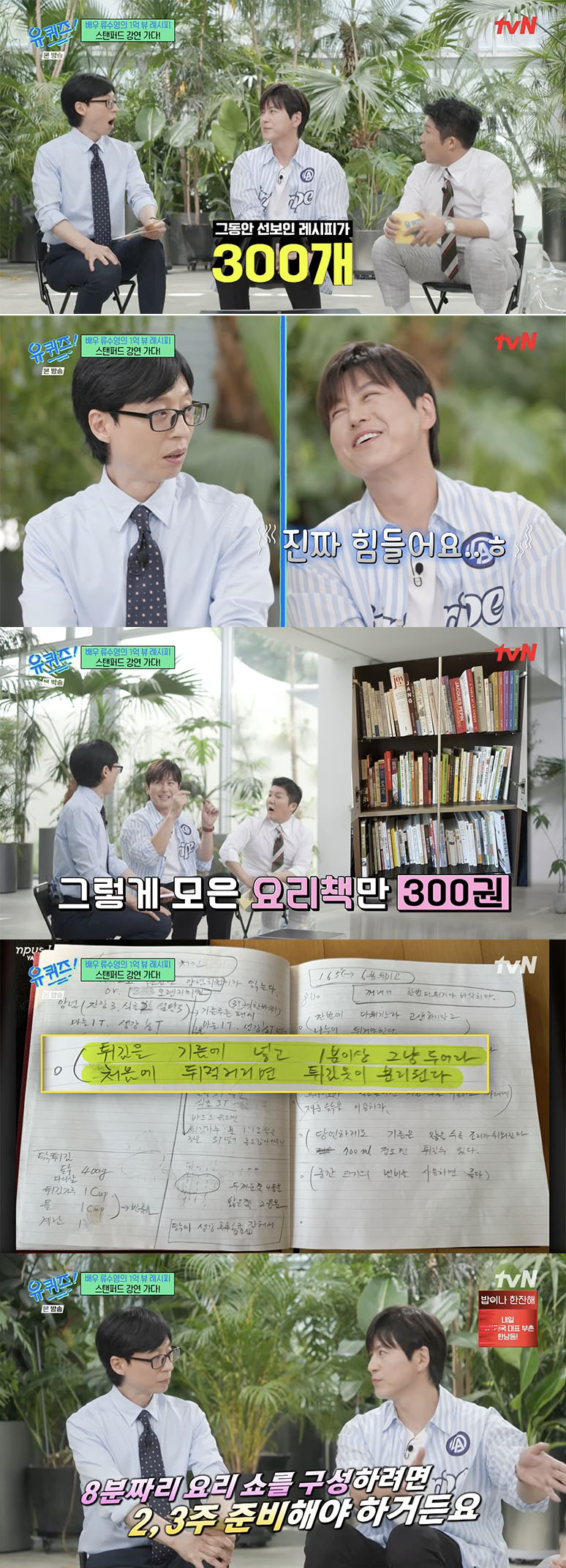 이어 그는 "다른 사람들 요리의 단점과 장점을 찾아서 만들고 있다. 그렇게 모은 요리 책이 300권이 넘는다. 저의 선생님들한테 저도 배운 거다"라고 레시피 연구 과정에 대해 얘기했다. 또 "연기도 1분 보여주려고 일주일 밤을 새운다. 요리도 비슷한 거 같다. 8분짜리 요리 쇼를 구성하기 위해 2, 3주를 준비한다. 대본 공부하는 느낌과 비슷하다"라며 본업인 연기와 요리의 공통점을 꼽기도 했다.