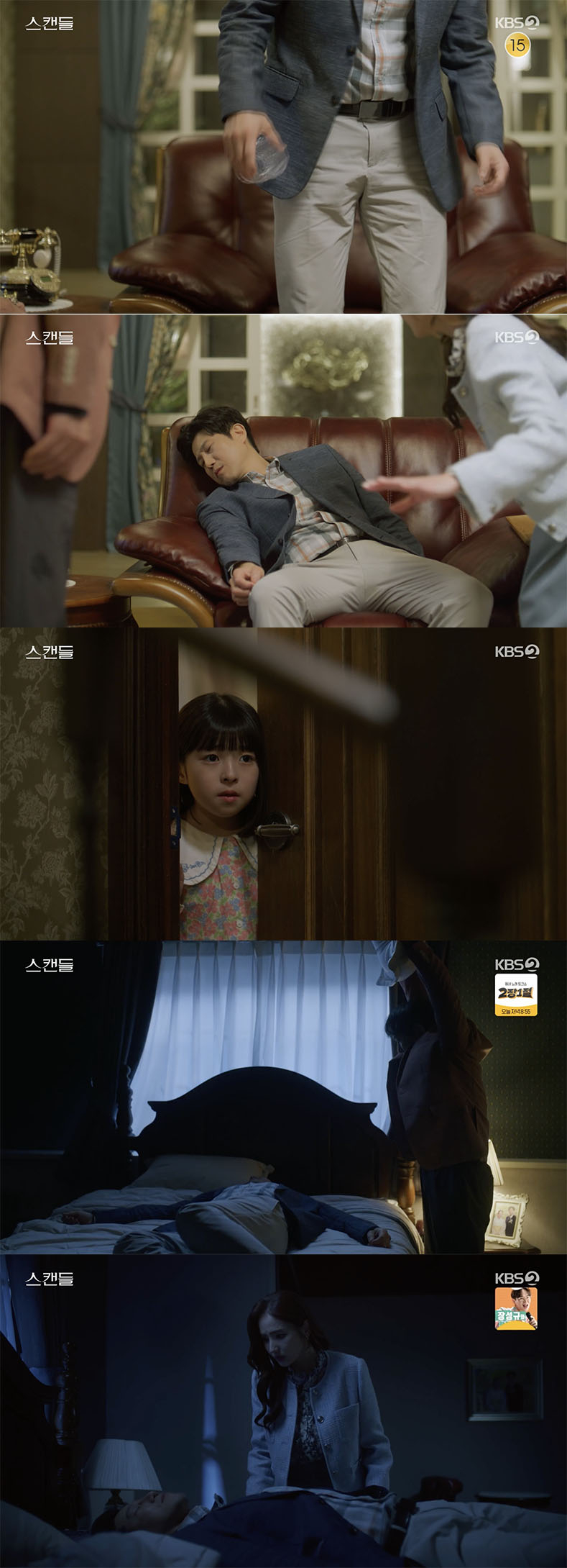 18일 방송된 KBS 2TV 일일드라마 '스캔들' 3회에서는 문경숙(한채영 분)이 민태창(이병준 분)과 공모해 백동호(최령 분)를 살해한 장면이 그려졌다.
