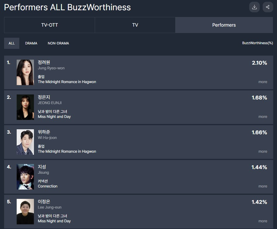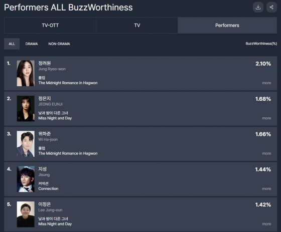 지난 25일 K-콘텐츠 경쟁력 분석 전문 기관인 굿데이터코퍼레이션의 공식플랫폼 펀덱스는 6월 3주 차 TV-OTT 출연자 화제성 결과를 발표했다. 정려원은 이 조사에서 3주 연속 드라마 부문은 물론이고 드라마/비드라마 부문 전체 출연자 중 화제성 1위에 이름을 올렸다.