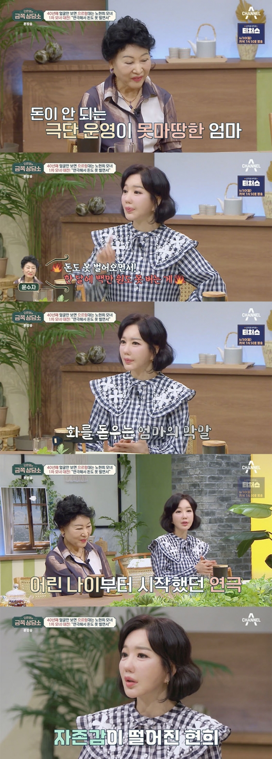 이날 노현희와 윤수자 모녀는 대화할수록 대화가 아닌 싸움으로 이어진다며 고민을 토로했다. 윤수자는 노현희에게 "수많은 공연을 해도 돈도 안 되는 연극만 해서 짜증이 난다"라며 못마땅함을 표했다.
