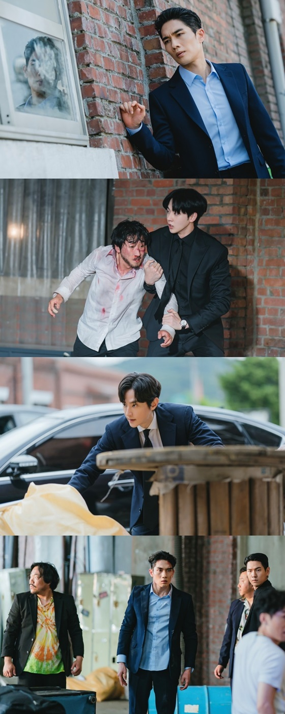 공개된 사진 속에는 엘리트 주일영(김현진 분)과 정윤택 구출 작전에 돌입한 서지환의 모습이 담겨 있다. 건물 밖에서 적의 동태를 파악하며 신중하게 때를 기다리는 서지환의 진지한 표정이 긴장감을 높이고 있다.