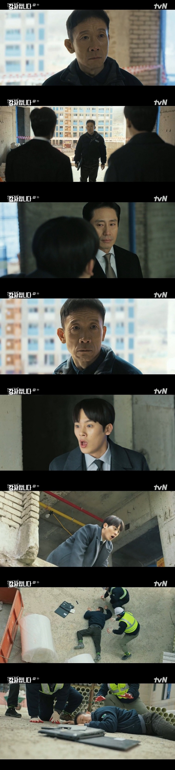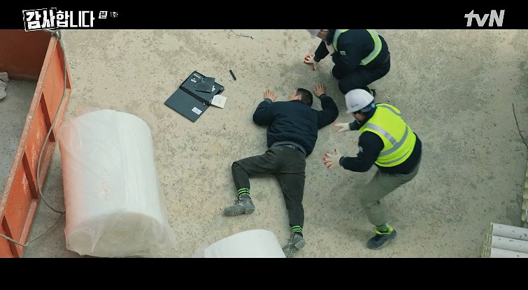 '감사합니다' 신하균의 추궁에 극중 직원이 공사장 아래로 추락했다.
