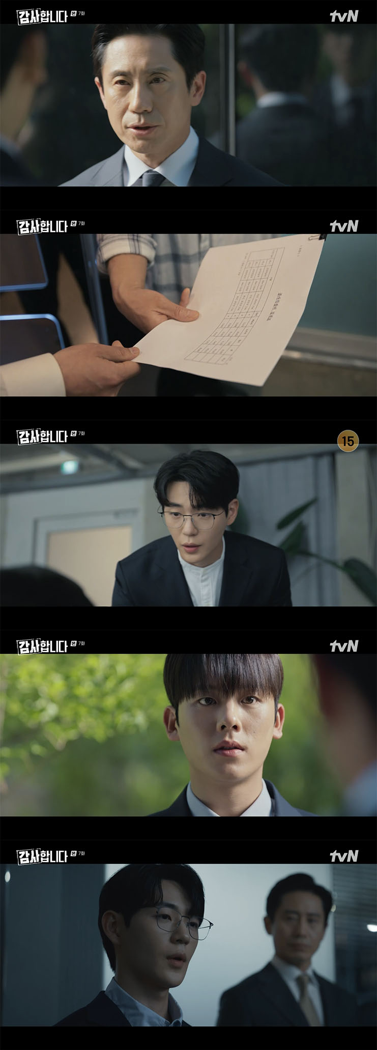 27일 방송된 tvN 토일드라마 '감사합니다' 7화에서는 구한수(이정하 분)가 직장 내 괴롭힘을 당하는 오윤우(김신비 분)를 돕는 장면이 그려졌다.