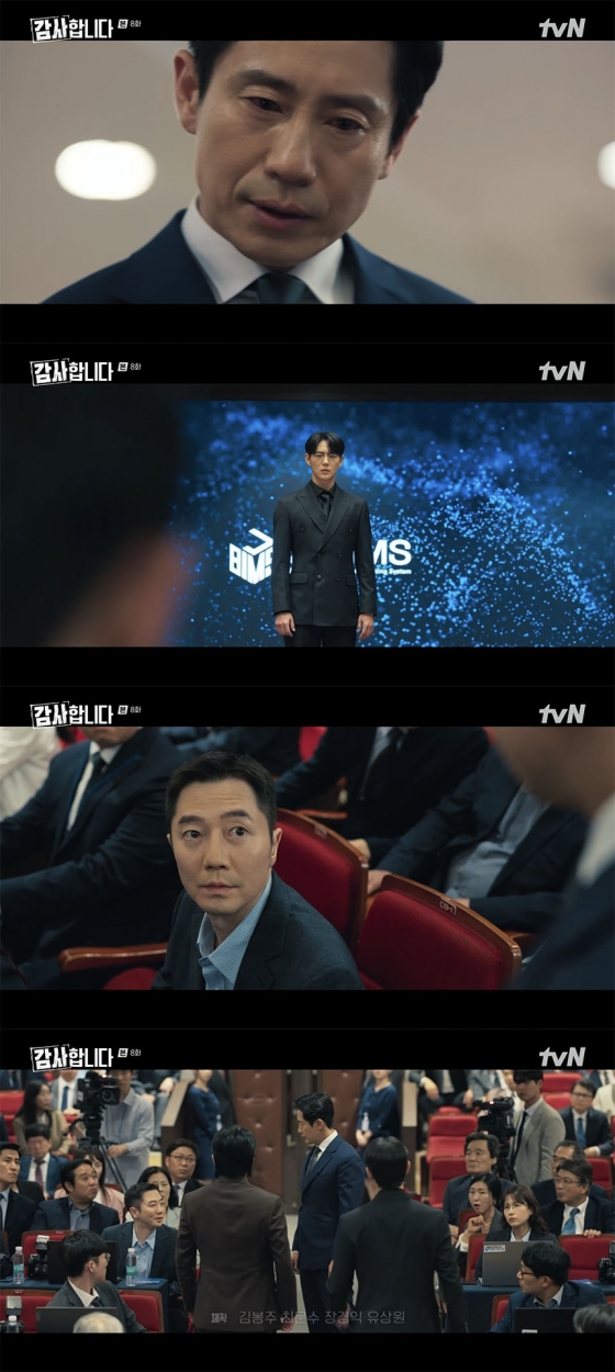 28일 방송된 tvN 토일드라마 '감사합니다' 8회에서는 신차일(신하균 분)이 JU건설의 신기술 J-BIMS 시연회를 중단시킨 장면이 그려졌다.