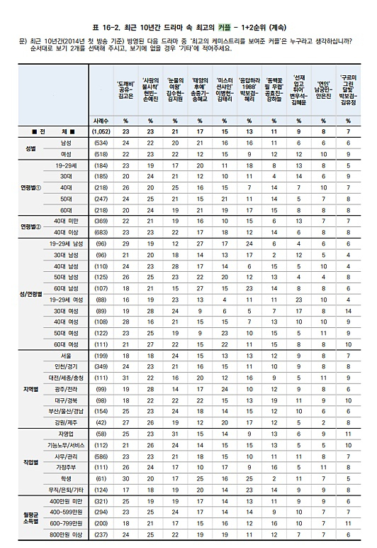 [스타뉴스 창간 20주년 한국갤럽 '최근 10년간 드라마 속 최고의 커플' 설문 결과]