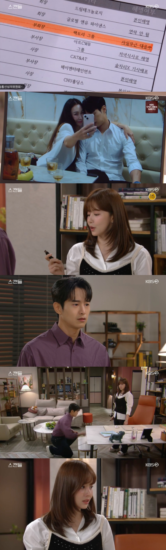 3일 방송된 KBS 2TV 일일드라마 '스캔들'에서는 문정인(한채영 분)의 지시로 접대 자리를 찾았던 정우진(최웅 분)이 백설아(한보름 분)와 갈등을 빚는 모습이 그려졌다.