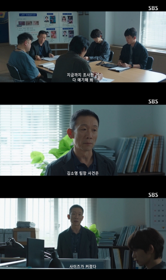 이어 최근 발생한 노봉구 연쇄살인사건에 대한 회의가 진행됐다. 수사 보고서를 찬찬히 읽어본 유 팀장은 "사람이 네 명이나 죽어 나가는데 그동안 뭐 했냐. 이러고도 니들이 경찰이냐"라며 후배들의 수사 부진을 질타했다.