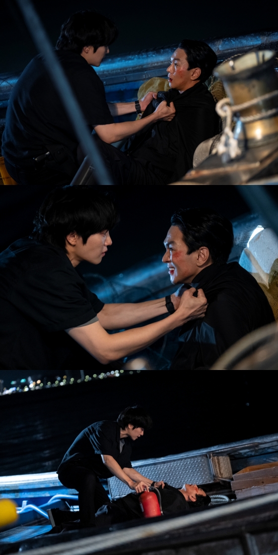 공개된 사진 속 한다온은 어둠이 내린 밤, 물 위에 뜬 배로 보이는 곳에서 정태규와 대치 중이다. 한다온은 상처투성이가 된 정태규의 멱살을 잡고 있다. 정태규를 꽉 쥔 손, 이글이글 번뜩이는 눈, 처절함으로 얼룩진 표정 등을 통해 한다온의 가슴속 커다란 분노와 절규가 고스란히 느껴진다. 그런 한다온 앞에서, 정태규는 악마 같은 미소를 지으며 한다온을 도발하는 모습이다.