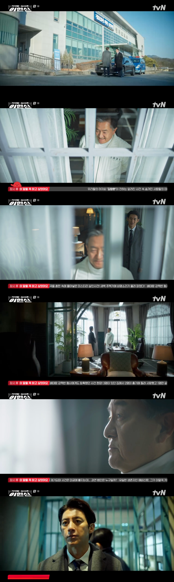18일 첫 방송된 tvN 새 월화드라마 '가석방 심사관 이한신'에서는 이한신(고수 분)이 지명섭(이학주 분)의 부친인 지동만 회장(송영창 분)을 이용해 가석방 심사관 복귀를 예고하는 모습이 그려졌다.