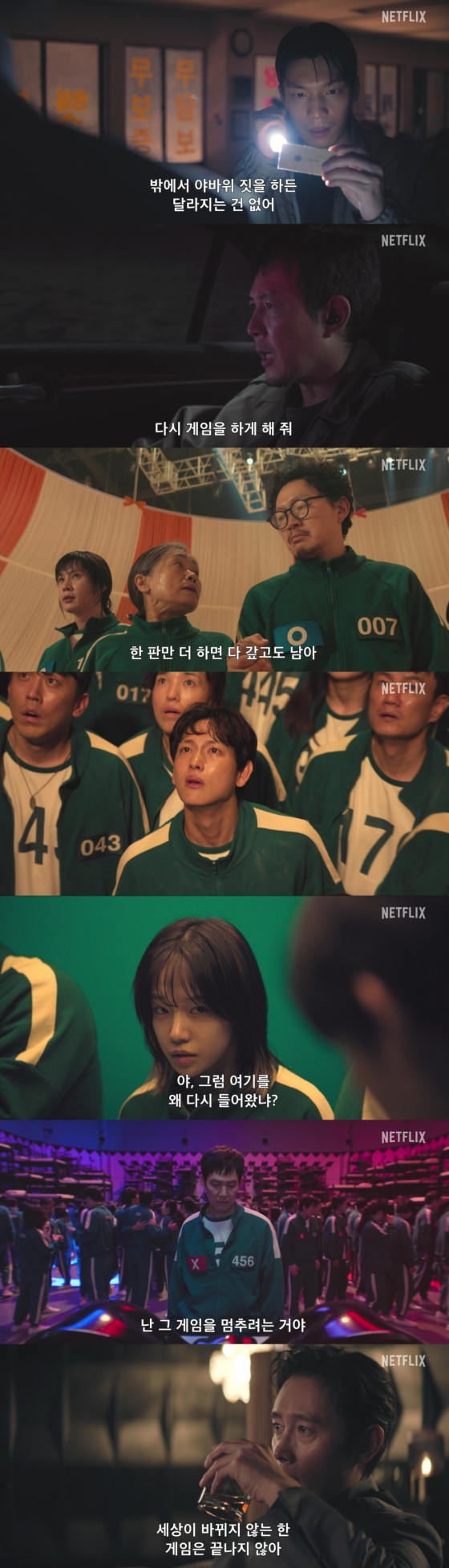 게임의 존속 여부에 대한 OX 투표는 참가자들 간의 엄청난 혼란과 갈등을 야기하고, "난 그 게임을 멈추려는 거야"라는 '기훈'의 말과 "세상이 바뀌지 않는 한 게임은 끝나지 않아"라는 '프론트맨'의 말은 완전히 상반된 가치관을 가진 두 사람의 치열한 대결에 대한 기대감을 더한다. 게임이 진행될수록 참가자들의 희비는 교차되고, '프론트맨'과 핑크가드들은 이를 지켜보며 더욱 잔혹한 게임을 이어가는 가운데, "456번, 게임에 돌아온 걸 환영하네"라며 본격적으로 '기훈'을 맞이하는 '프론트맨'의 모습은 과연 이들의 대립이 어떤 결말을 맞이할지 궁금증을 자극한다.