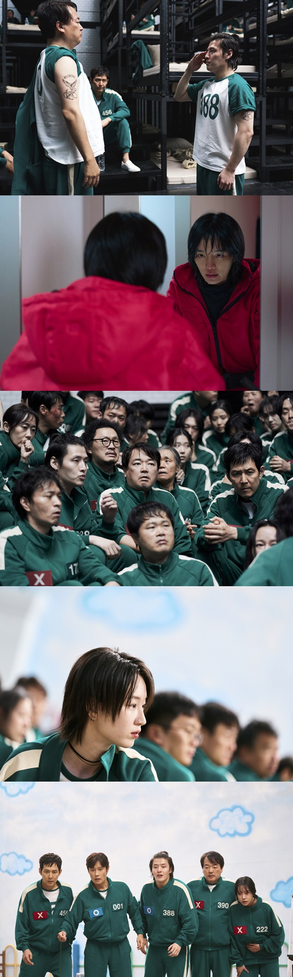 함께 공개된 미공개 스틸은 '오징어 게임' 안팎으로 얽히고설킨 인물들의 다채로운 모습들을 포착해 눈길을 사로잡는다.