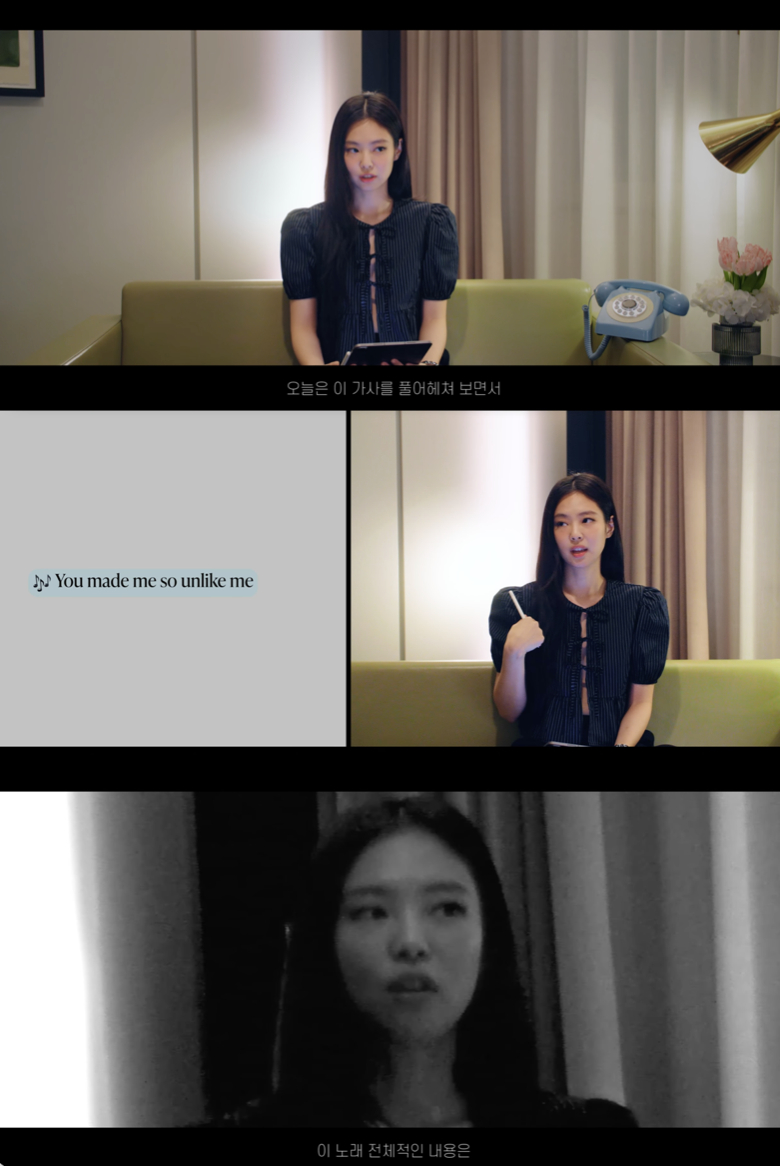 제니는 "제가 앨범에서 가장 좋아하는 곡이다. 오늘은 이 가사를 한 줄 한 줄 풀어헤쳐 보면서 저만의 해석도 여러분에게 알려드리고 전체적인 곡에 대해 이야기를 나눠보려고 자리를 마련했다"라며 콘텐츠의 기획 의도를 전했다.