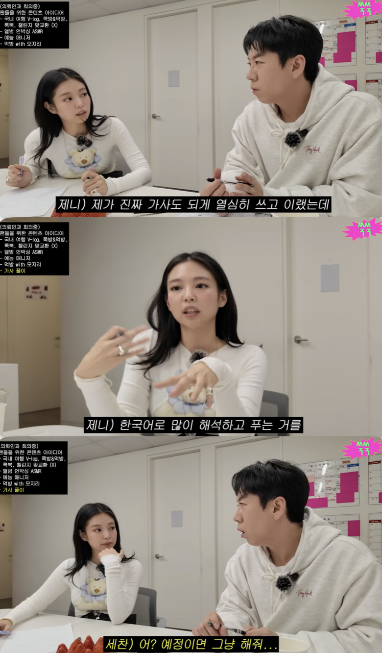 '그냥 해줬으면 좋겠다'는 양세찬의 조언에 "맞다, 그렇게 된다"며 공감하고 회의록에 직접 '가사 풀이 콘텐츠'라는 문구를 적었던 제니는, 단순한 말뿐이 아닌 진짜 실행으로 약속을 지켜낸 것.