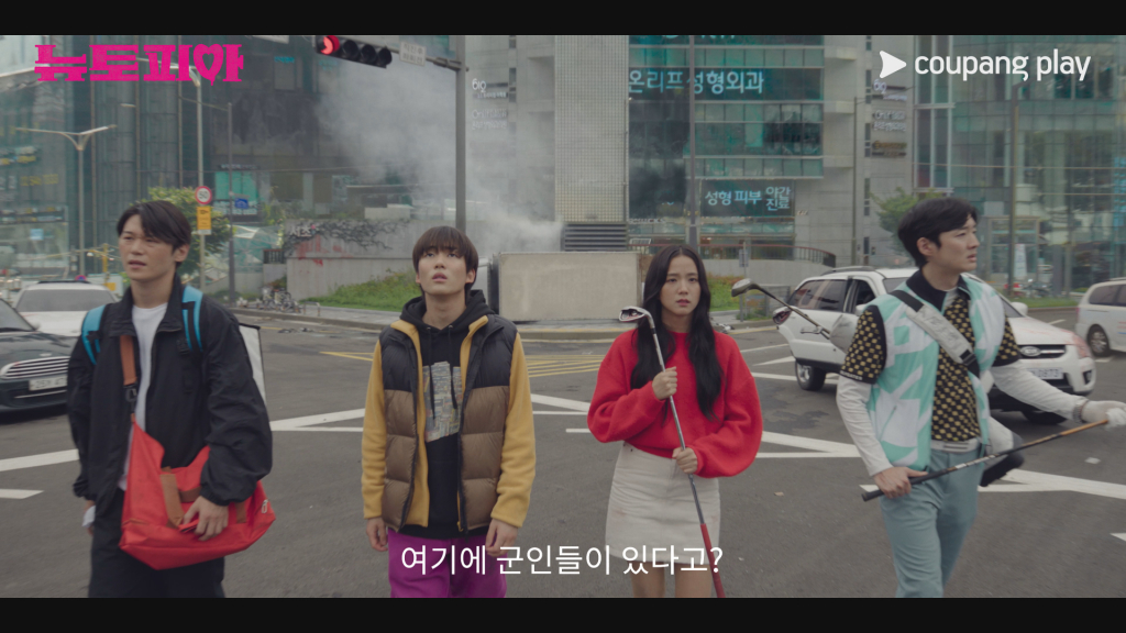 쿠팡플레이 시리즈 '뉴토피아'는 군인 재윤과 곰신 영주가 좀비에 습격당한 서울 도심을 가로질러 서로에게 달려가는 이야기다.