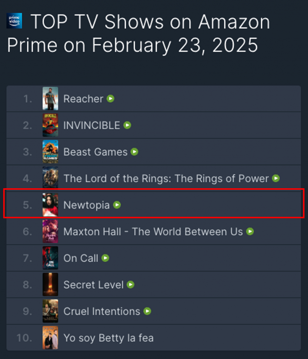 '뉴토피아'에서 '재윤'(박정민)과 '영주'(지수)의 풋풋하고 사랑스러운 캠퍼스 커플 시절 서사가 공개된 후, 4화에 대박한 시청자들의 반응이 폭발적이다. OTT 콘텐츠 순위 집계 사이트 플릭스패트롤(FlixPatrol)에 따르면 '뉴토피아'는 프라임 비디오 전세계 TV시리즈 5위(2월 23일 기준)에 오르며 해외에서도 거센 '좀콤' 열풍을 이어가고 있다.