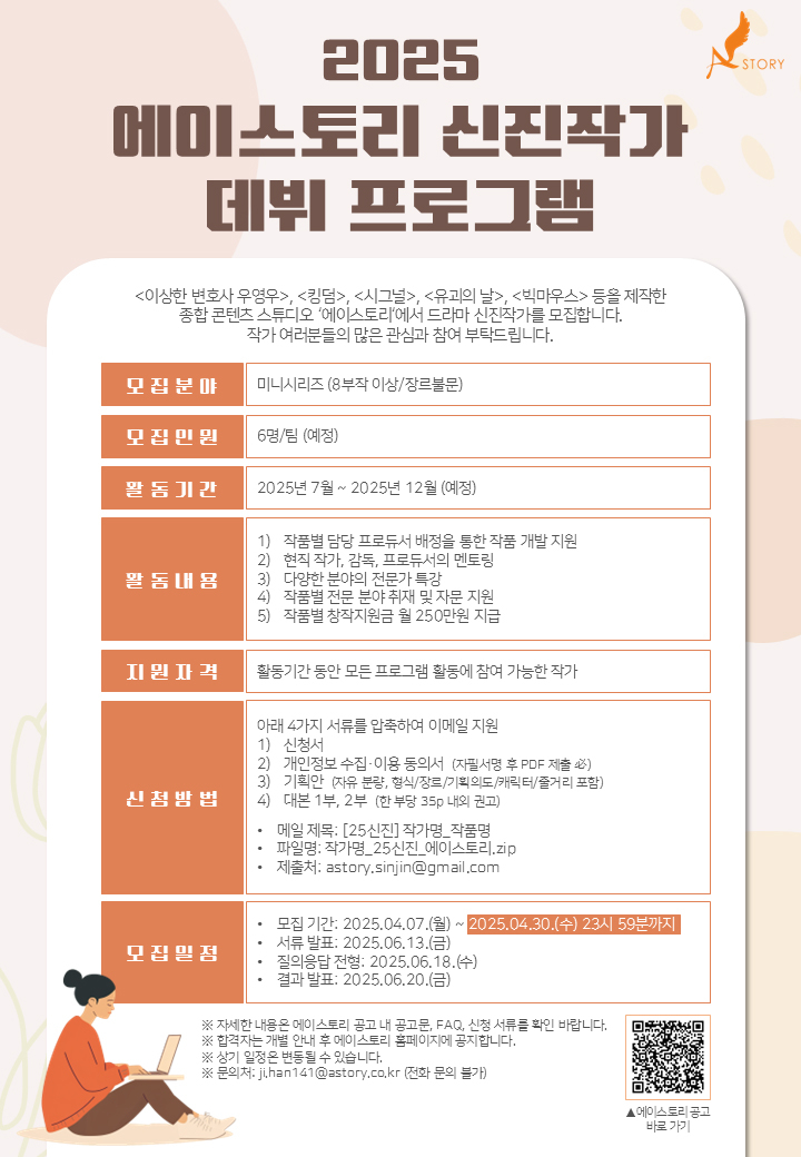 종합 콘텐츠 스튜디오 에이스토리가 오는 4월 7일부터 '2025 신진작가 데뷔 프로그램'의 지원자 모집을 시작한다.