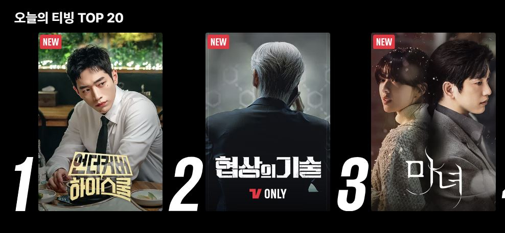 채널A '마녀'도 10일 티빙 앱 내 실시간 순위 3위에 오른 수급작이다. 자신을 좋아하는 사람은 다치거나 죽는다는 이유로 '마녀'라 불리는 미정 역을 맡은 노정의의 연기가 호평을 받는 중이다. 애처로운 모습과 함께 서서히 동진(박진영 분)에게 마음이 열리는 섬세한 감정선을 연기하며 이미지 변신에 성공했다는 평을 받고 있다.