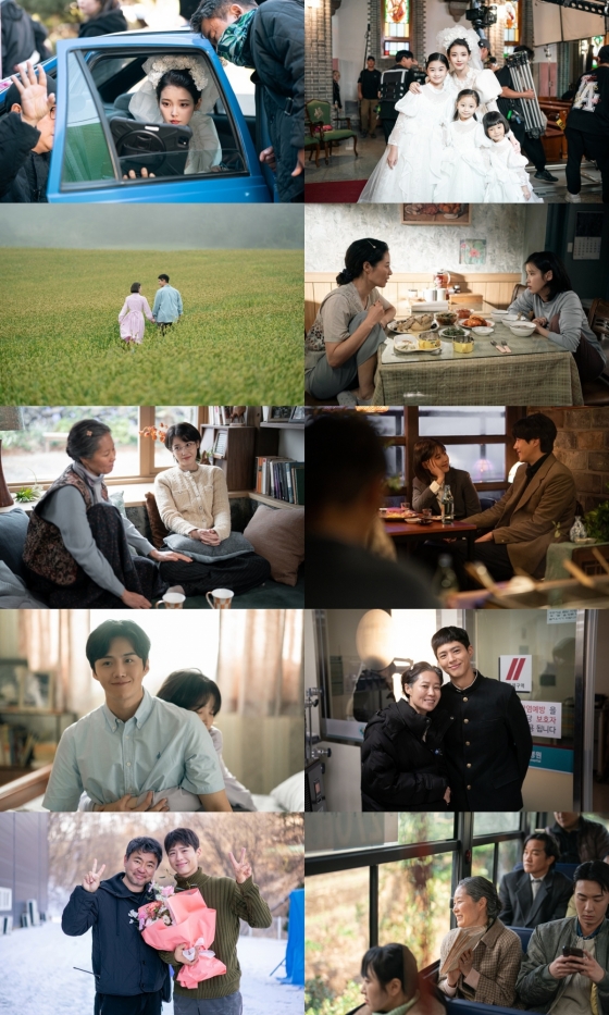 함께 공개된 비하인드 스틸과 미공개 스틸은 배우들의 열연이 담긴 순간부터 화기애애했던 촬영 현장까지 카메라의 앞과 뒤를 모두 담았다. 청춘 시절의 '애순'(아이유)부터 결혼식 날 웨딩드레스를 입은 '금명'(아이유)까지, 아이유는 다른 분위기로 1인 2역을 완벽히 소화했다. 아빠 '관식'(박해준)의 눈에 늘 아기 같았던 '금명'처럼, '금명'의 어린 시절을 그린 배우들 또한 웨딩드레스를 입은 신부의 모습으로 사진 속에 함께 담겼다.