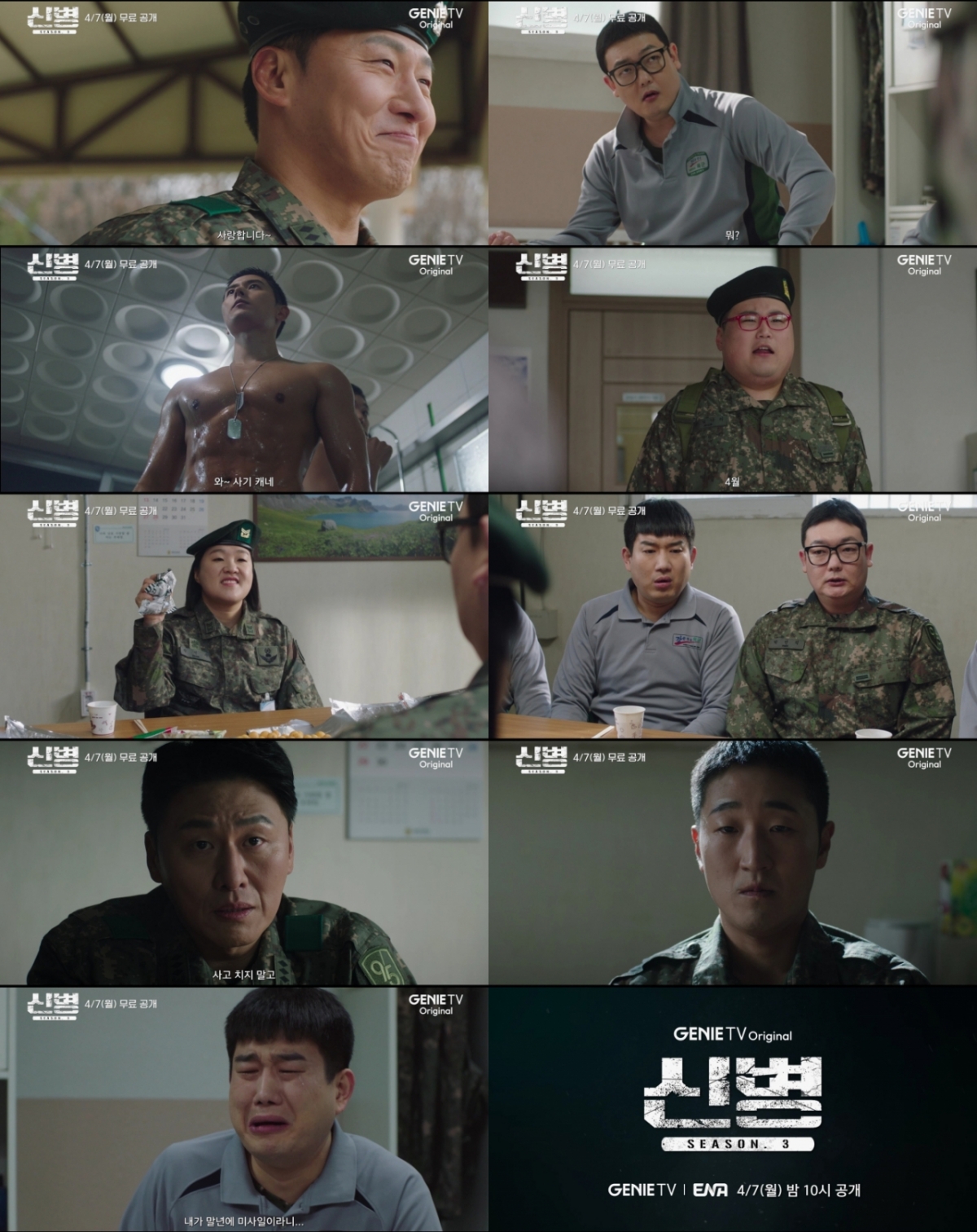 동명의 메가 히트 애니메이션에서 출발한 '신병'은 좋은 놈부터 나쁜 놈, 이상한 놈까지 별별 놈들이 모두 모인 그곳에 '군수저' 신병이 입대하면서 벌어지는 이야기를 그린 하이퍼 리얼리즘 코미디. '신병3'는 예측 불허 두 신병의 전입과 역대급 빌런의 복귀로 비상이 걸린 신화부대, 상병 진급을 앞두고 꼬여버린 박민석(김민호 분)의 난이도 급상승한 군생활이 진한 웃음과 유쾌한 공감을 자아낼 것으로 기대를 모은다.