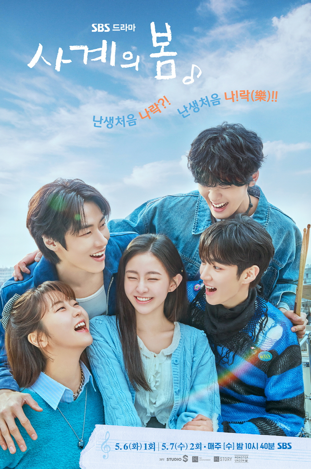 이와 관련 '사계의 봄' 하유준, 박지후, 이승협, 김선민, 서혜원이 드라마의 싱그러움을 온몸으로 표현한 '밴드 포스터'가 첫 공개됐다. 극 중 대학 밴드부인 다섯 명이 서로를 마주 보며 활짝 웃어 청춘이 가진 희망찬 기운을 전달한다.