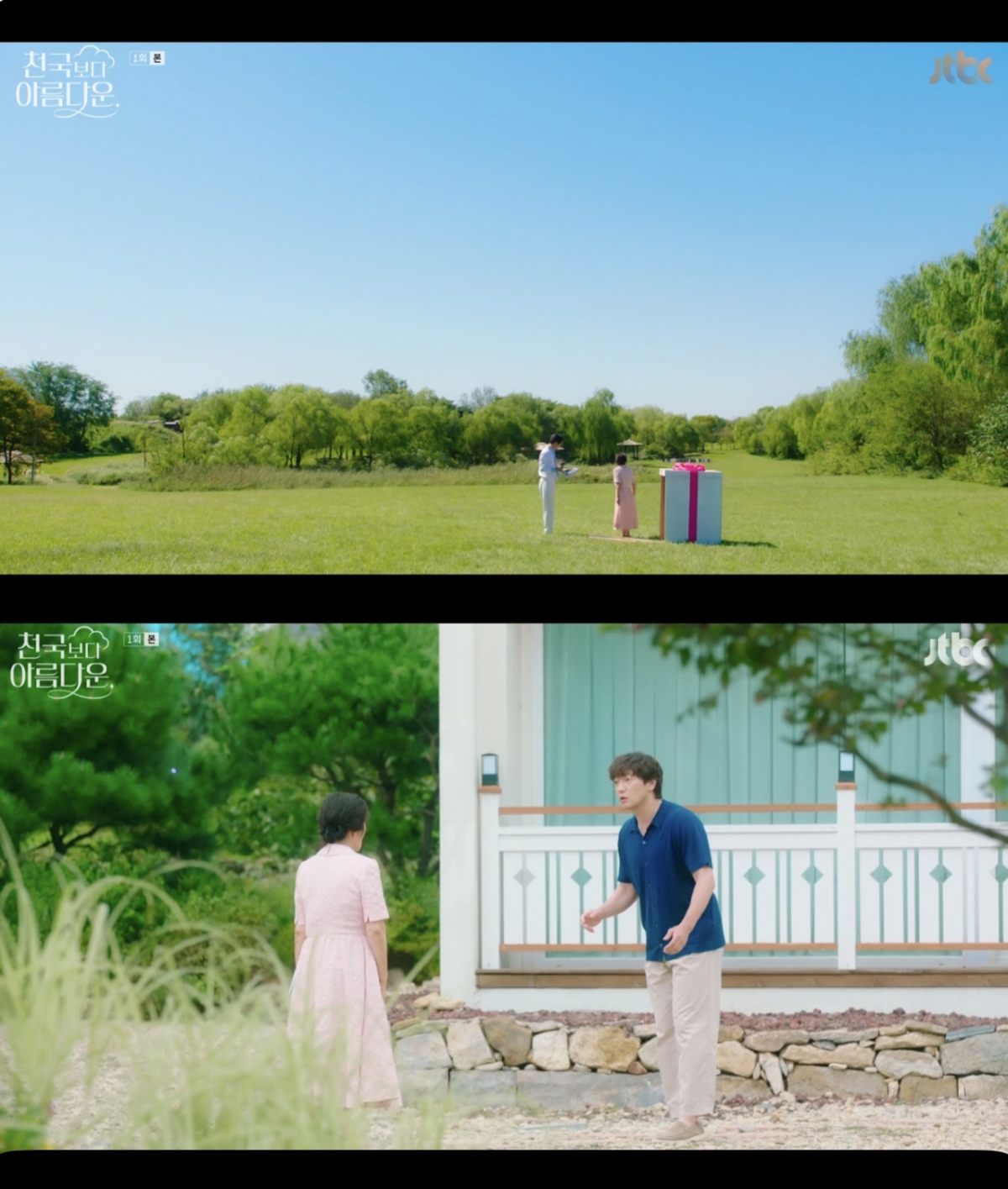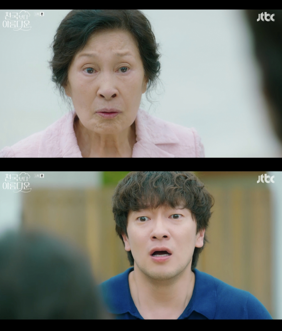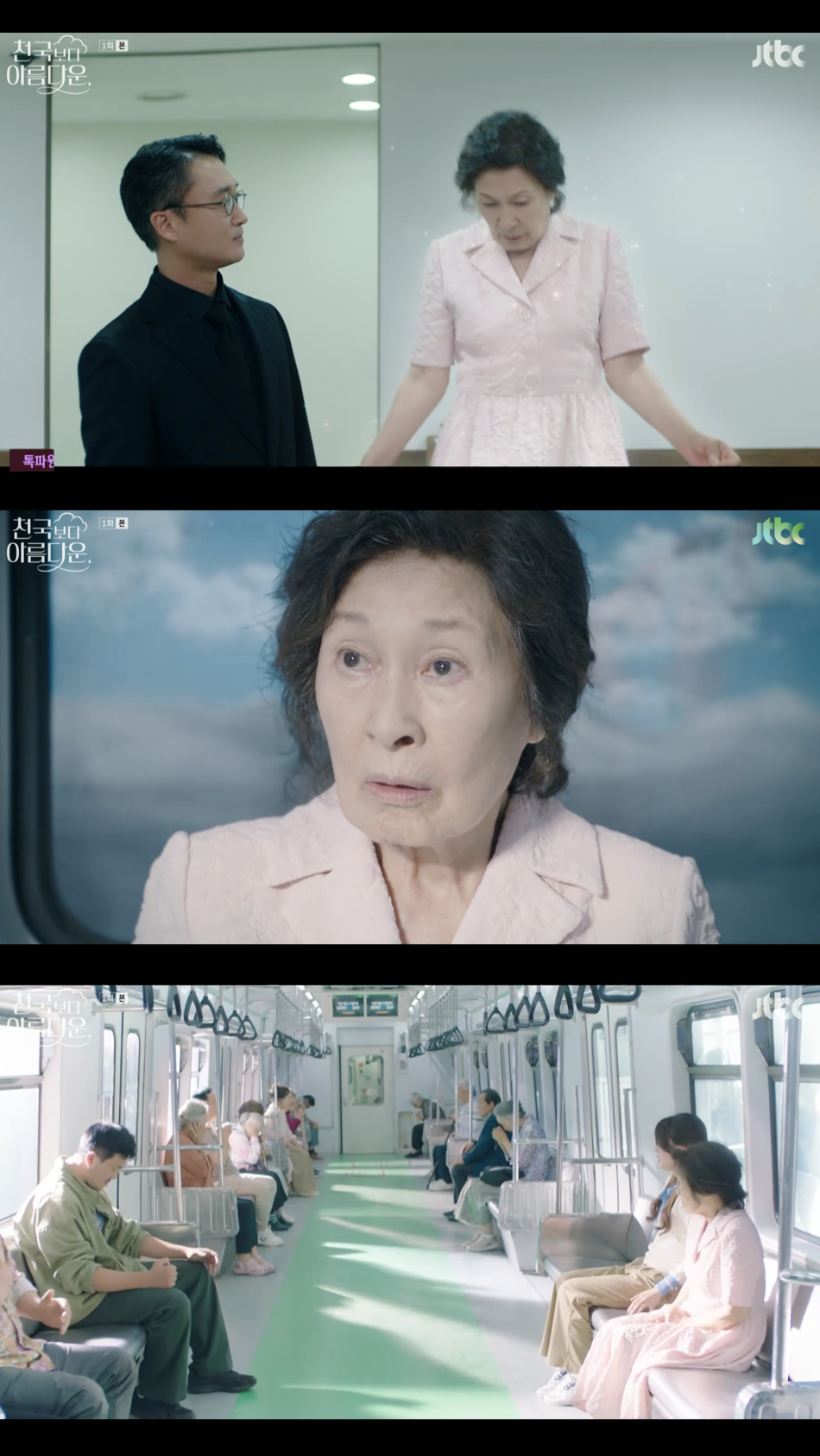 19일 첫 방송된 JTBC 토일드라마 '천국보다 아름다운'에서는 이해숙(김혜자 분)이 의심하던 천국행 열차 탑승에 성공한 가운데, 1년 전 먼저 떠난 남편과 재회한 모습이 그려졌다.