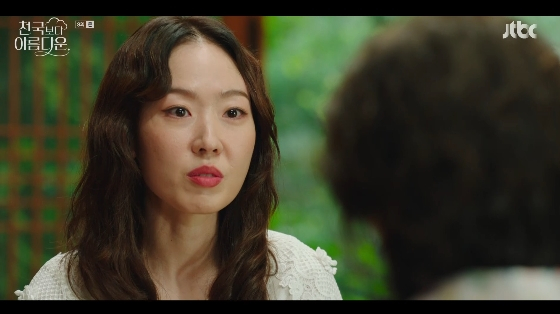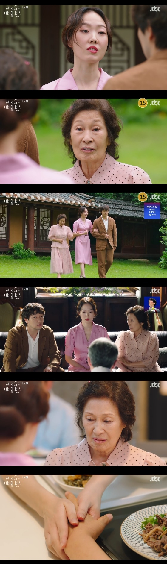11일 방송된 JTBC 토일드라마 '천국보다 아름다운'에서는 박종귀(주민경 분)가 환생을 결심한 뒤 이를 며느리 이해숙(김혜자 분)에게 전하는 모습이 그려졌다.