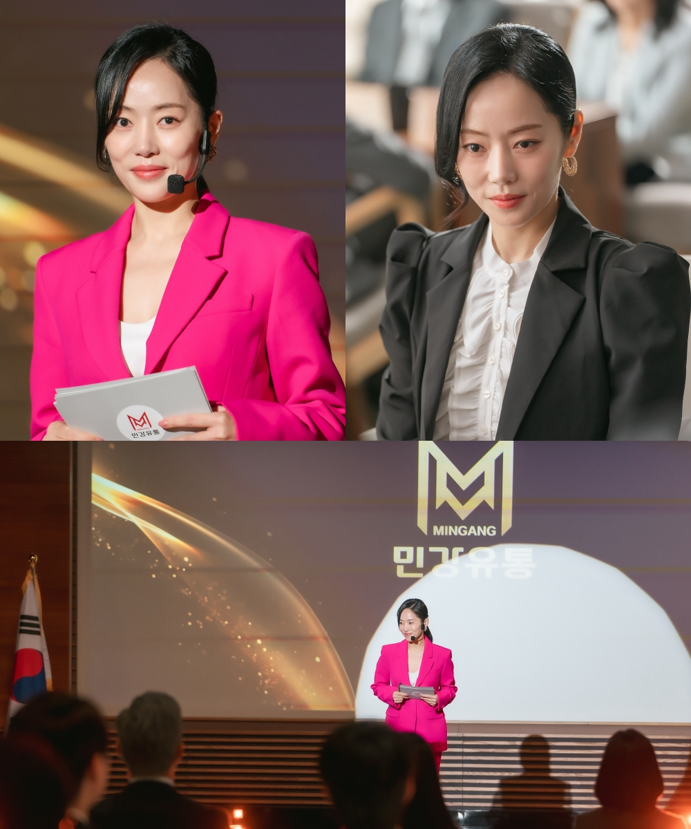 이 가운데 공개된 스틸에는 야심과 지성을 겸비한 민경채 캐릭터에 완벽히 동화된 윤아정의 모습이 담겨있다. 먼저 핑크색 재킷을 입고 마이크 앞에 당당하게 서 있는 모습은 민경채의 프로페셔널하고 자신감 넘치는 면모를 고스란히 보여준다. 사람들을 향한 흔들림 없는 눈빛에서 확신과 강한 의지가 엿보이는 것은 물론, 경영인이 갖춰야 할 카리스마와 매력을 동시에 확인할 수 있다. 무엇보다 민강 유통의 로고를 배경으로 많은 사람들 앞에서 존재감을 발휘하며 위풍당당하게 서 있는 자태만으로도 그가 민강 유통의 핵심 인물임을 짐작케 한다.
