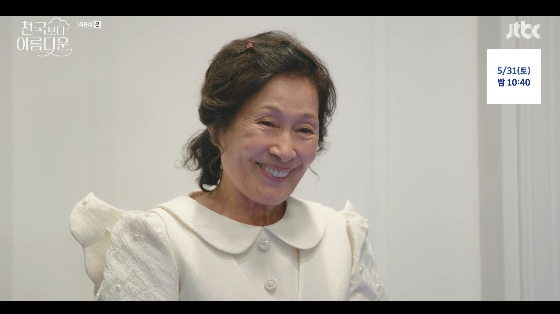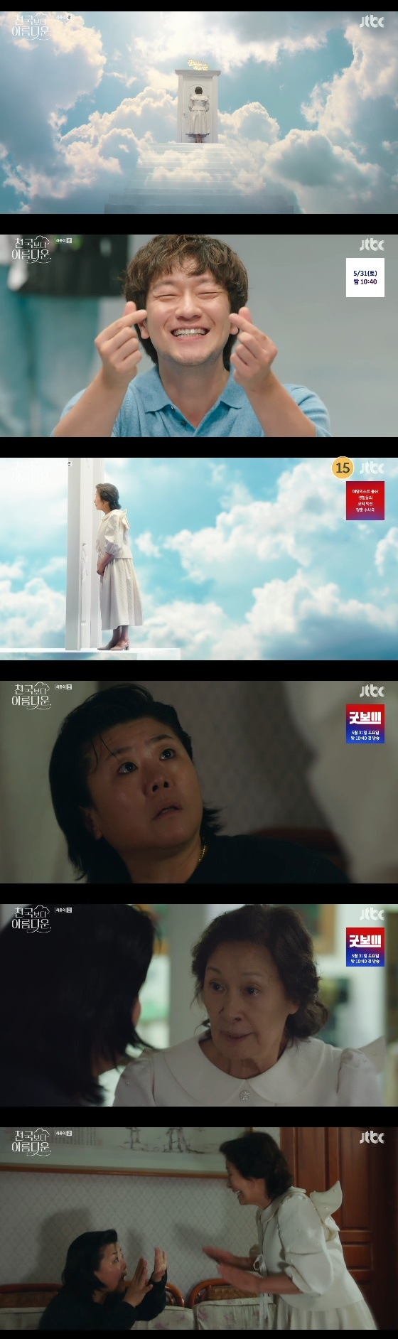 25일 방송된 JTBC 토일드라마 '천국보다 아름다운' 최종회에서는 지상으로 돌아간 이영애(이정은 분)에게 로또 당첨 번호를 알려주기 위해 그의 꿈속으로 들어간 이해숙(김혜자 분)의 모습이 그려졌다.