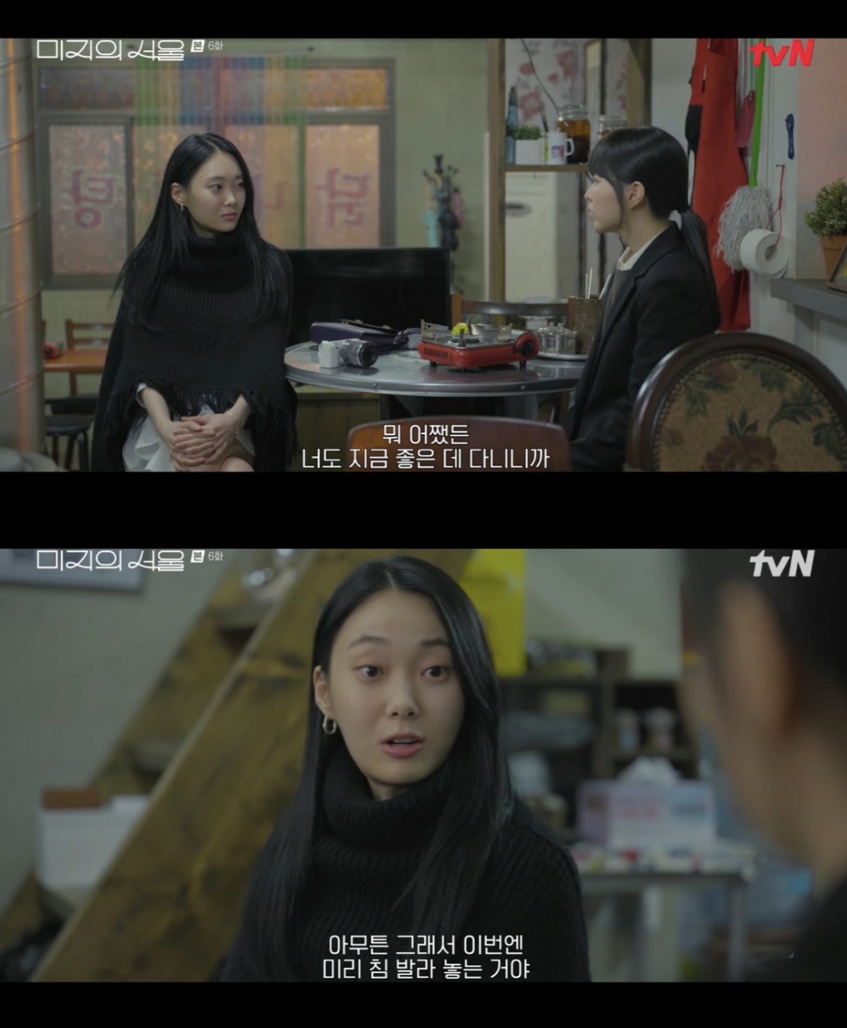 8일 방송된 tvN 토일드라마 '미지의 서울' 6회에서는 박지윤(유유진 분)이 유미지(박보영 분)에게 이호수(박진영 분)를 향한 감정을 솔직하게 털어놓는 장면이 그려졌다.