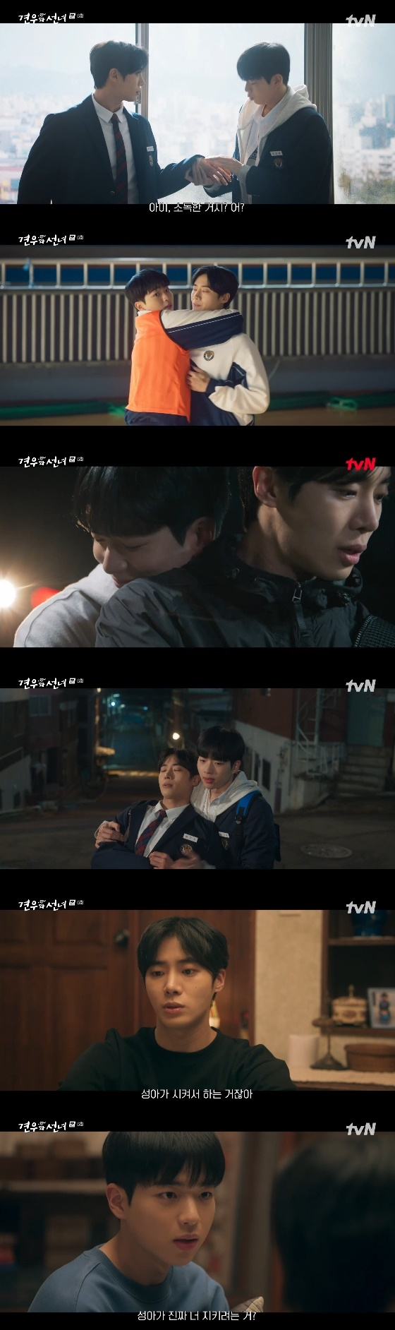 8일 방송된 tvN 월화드라마 '견우와 선녀' 6회에서는 박성아(조이현 분)의 요청으로 24시간 배견우(추영우 분)를 끌어안는 표지호(차강윤 분)의 모습이 그려졌다.