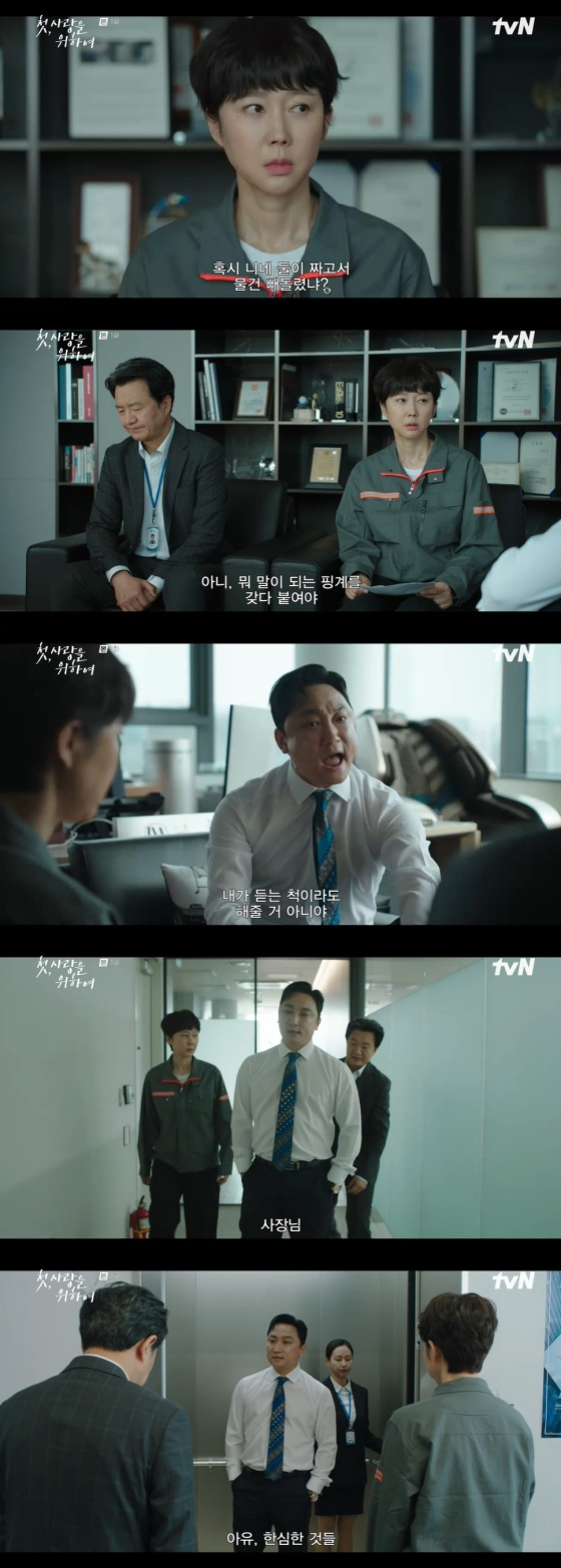 4일 첫 방송된 tvN 새 월화드라마 '첫, 사랑을 위하여'에서는 이지안(염정아 분)이 건설사 사장(양현민 분)에게 모욕을 당하는 모습이 그려졌다.
