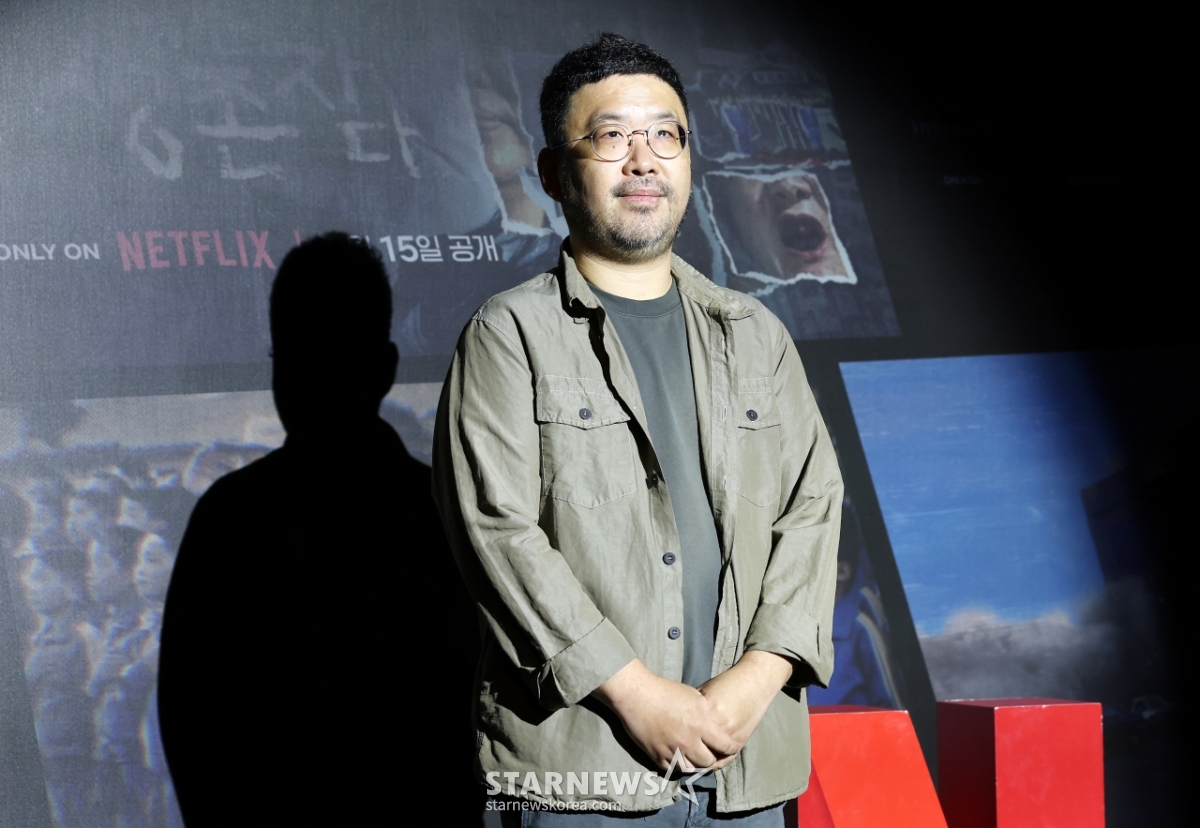 조성현 PD가 13일 서울 용산구 CGV용산에서 진행된 넷플릭스 다큐 '나는 생존자다' 제작발표회에 참석해 포즈를 취하고 있다.