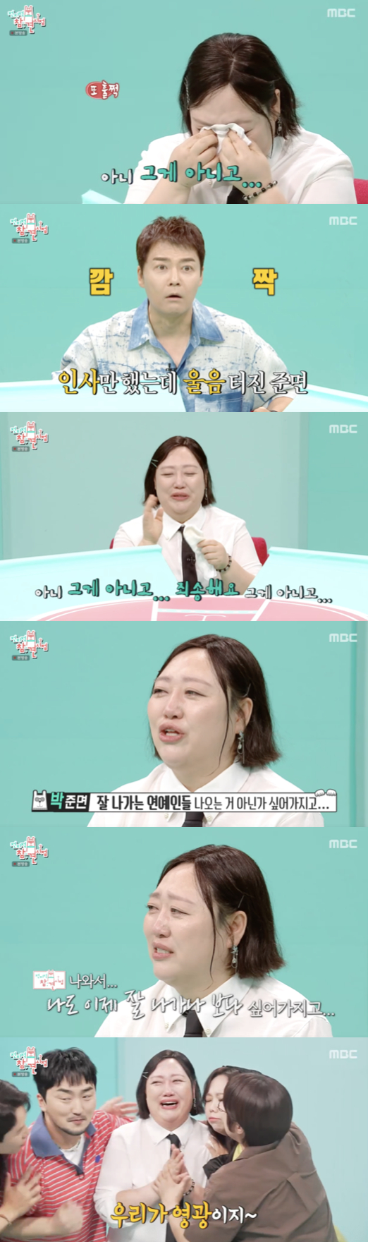 이유를 듣자 '전참시' 멤버들이 일어나 박준면을 따뜻하게 안아주며 달래주는 모습까지 이어졌다. 예상치 못한 '눈물의 오프닝'은 귀여운 해프닝으로 마무리됐고, 스튜디오는 웃음바다가 됐다.