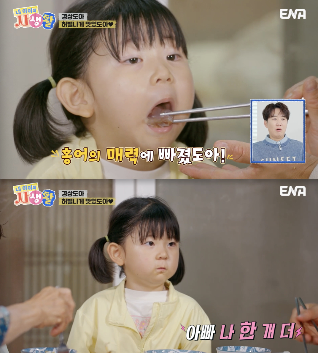 과감하게 홍어회를 집어 든 도아는 냄새에 잠시 당황했지만, 이내 "아빠 나 한 개 더"라며 오히려 더 달라는 당찬 반응을 보였다. 냄새 맡을 틈도 없이 손으로 빠르게 집어 먹는 모습은 보는 이들의 탄성을 자아냈다.