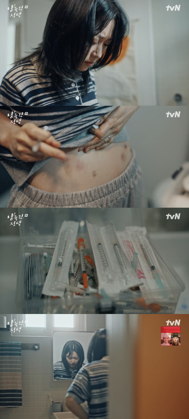 극 중 김도영은 화장실 선반 아래에서 수북이 쌓여 있는 주사기들을 발견했다. 그것은 다름 아닌 이유진이 난임수술과 치료 과정에서 임신을 위해 홀로 자신의 배에 직접 놓아야 했던 호르몬 주사들이었다. 말없이 버려진 수많은 주사기가 그간 이유진이 겪었던 고통과 외로움을 대변하고 있었다.